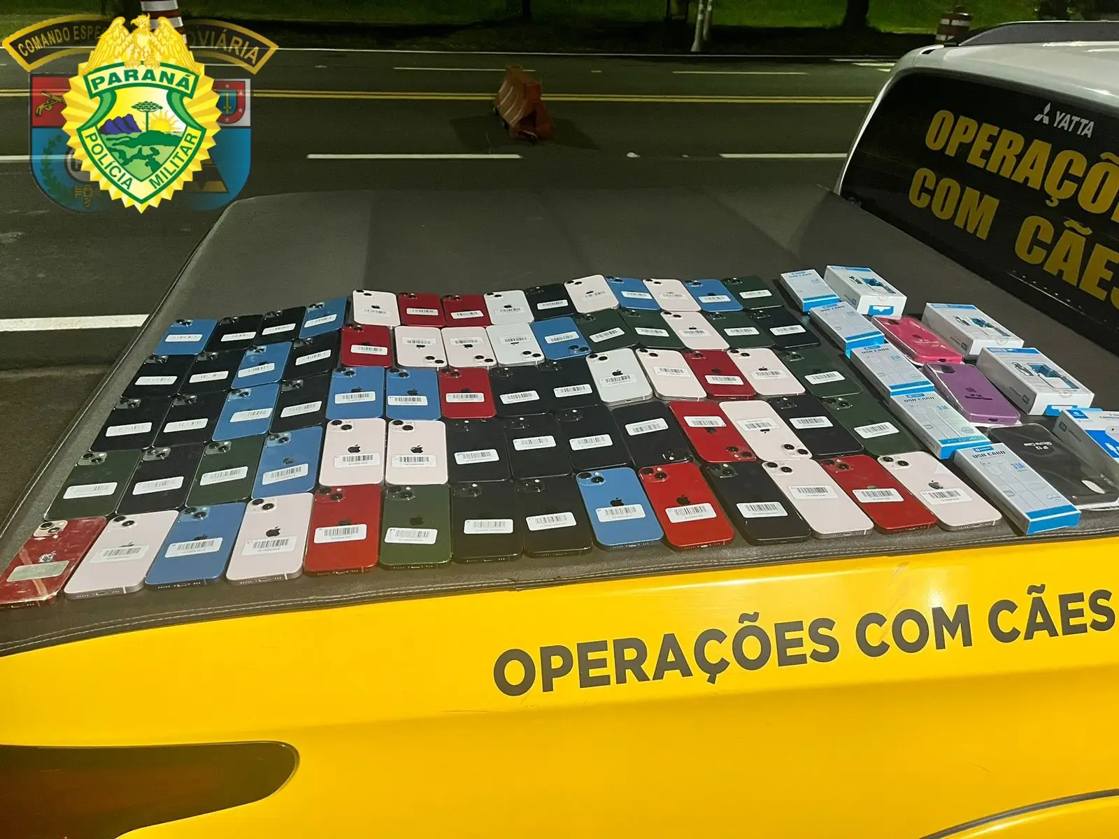 A Polícia Rodoviária Estadual (PRE) apreendeu, na noite desta terça-feira (23), 70 celulares iPhone que estavam dentro de duas malas de um passageiro de ônibus na PR-323, em frente ao Posto Policial Rodoviário de Cruzeiro do Oeste. Os aparelhos eram de um jovem, de 24 anos, que é morador de Umuarama.