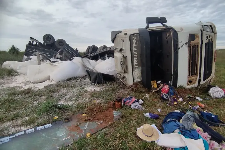 Na sequência, o condutor perdeu totalmente o controle da direção, saindo da pista e capotando o Volvo, despejando a carga de calcário que estava transportando. Apesar do capotamento, o motorista conseguiu sair sozinho do veículo tombado.