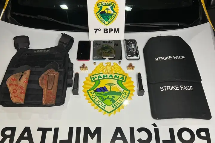 A Polícia Militar (PM) apreendeu coletes balísticos e carregadores de pistolas após um confronto armado em frente a uma residência de Tapejara, na noite desta quarta-feira (24). O suspeito, de 27 anos, conseguiu fugir, porém sua esposa, de 19, foi detida pelos policiais.