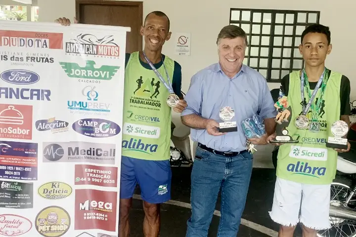 O filho de Anderson, Kaio Henrique Souza, também foi destaque e conquistou a terceira colocação na categoria 16 a 24 anos. Ambos visitaram o prefeito Celso Pozzobom na manhã desta quinta-feira (2) para apresentar os troféus e medalhas recebidos por suas vitórias correndo 10 quilômetros a partir da largada, no Ginásio de Esportes Antônio Lacerda Braga.