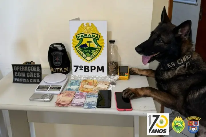 A força tarefa cumpriu um mandado de busca e apreensão no imóvel, sob suspeita de tráfico de drogas, e com auxílio do cão farejador, encontraram as drogas, além de R$ 1.243 em notas diversas e R$ 99,30 em moedas. Balança de precisão e celulares também foram encontrados.