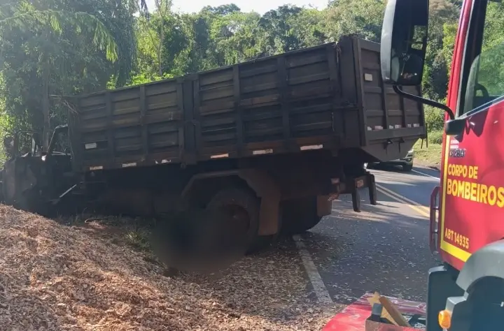 Aparentemente, o caminhoneiro perdeu o controle do veículo no trecho de descida. O caminhão saiu da pista e colidiu em um barranco. O condutor foi ejetado da cabine. Parte da carga de madeira picada acabou caindo no acostamento da rodovia.