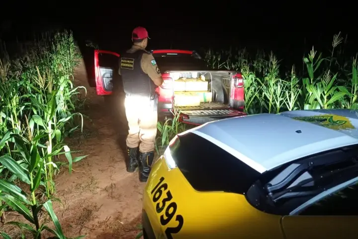 A apreensão aconteceu por volta das 2h, quando uma equipe estava em fiscalização no posto policial rodoviário de Iporã e avistou o farol de um veículo que estava desviando por uma estrada rural próxima – que é frequentemente utilizada para evitar o posto policial. A equipe foi até o local e lá encontrou, abandonada, a caminhonete emplacada em Terra Rica, no meio de uma plantação de milho.
