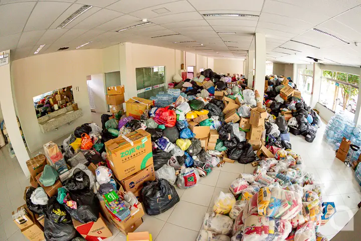 OBemdito conversou na tarde desta quinta-feira (9) com Neli Teixeira, que está ajudando voluntariamente a organizar as contribuições e as pessoas que estão ajudando no local. Ela disse que a arrecadação teve início em frente ao Hospital Nossa Senhora Aparecida, onde foi estacionado um caminhão para a comunidade entregar donativos. Como a ação ganhou um grande volume, optou-se por mudar o local de entrega para este barracão.
