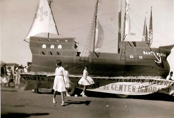 Ainda bem que na década de 1960 Umuarama ainda não tinha redes de energia elétrica... Caso houvesse, seria impossível construir uma caravela tão alta para desfilar pela Avenida Paraná. A “Santa Maria” era realmente impressionante pelas suas dimensões, peso e formato e suas linhas seguiam as da embarcação original com que Cristovão Colombo singrou os mares para descobrir a América! Detalhe: comparem a altura do carro alegórico com a estatura das pessoas próximas... - Foto: Acervo Italo Fábio Casciola