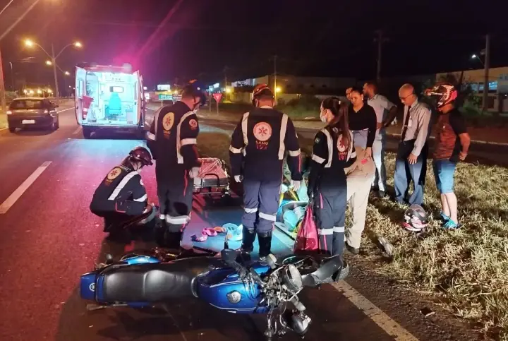 A motocicleta era conduzida por um homem de origem haitiana. Ele foi encaminhado pelos socorristas para o Hospital Nossa Senhora Aparecida com suspeita de fratura na costela e outros ferimentos.