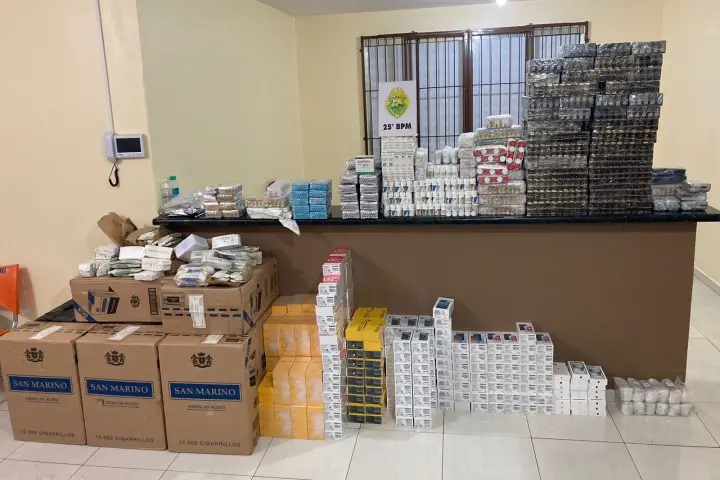 No local, além do primeiro carro, os policiais encontraram um segundo Fiat Uno. Ambos estavam carregados com 10 caixas de cigarros, além de medicamentos, anabolizantes e celulares contrabandeados e descaminhados do exterior.
