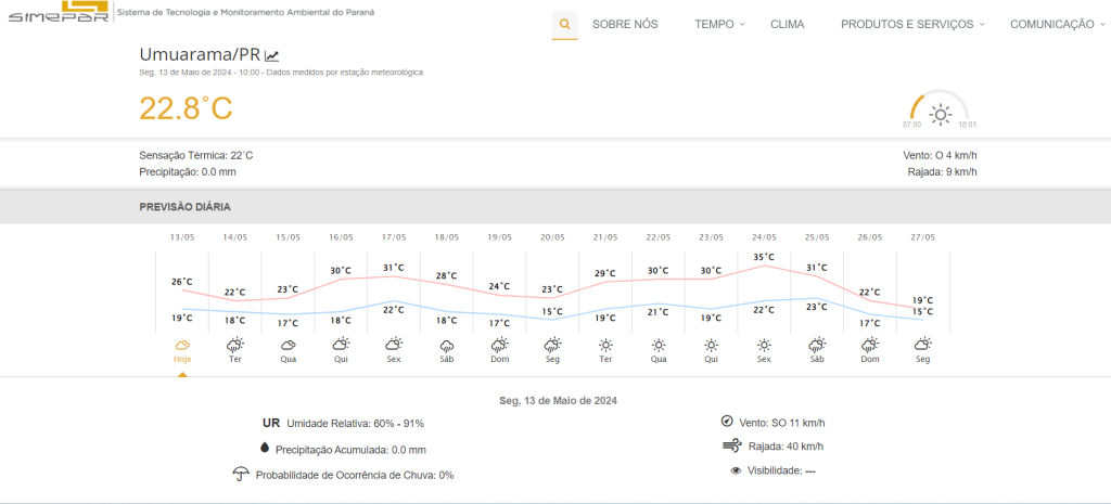 A semana começou com queda nas temperaturas e previsão de chuvas para os próximos dias em Umuarama. Conforme o Simepar (Sistema de Tecnologia e Monitoramento Ambiental do Paraná), a previsão é de pouco mais de 35 milímetros, com o maior volume previsto para o fim de semana.