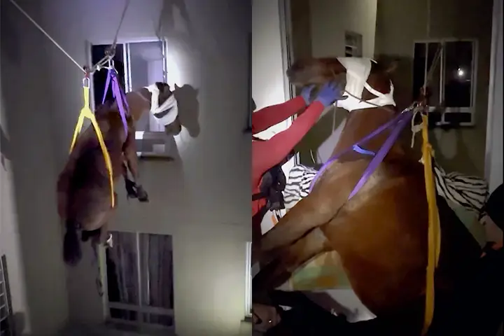 Uma égua precisou ser içada para ser resgatada de um prédio residencial em São Leopoldo, no Vale do Sinos, no Rio Grande do Sul, nesta terça-feira (14). O resgate que foi conduzido pelo Corpo de Bombeiros da cidade, durou 7 horas e contou com a participação de cerca de 15 pessoas. A égua foi retirada pela janela do apartamento.