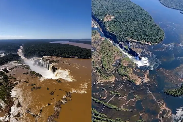 Imagens divulgadas pela página do Instagram do consórcio Urbia Cataratas revelaram a diferença da vazão das águas nas Cataratas do Iguaçu, em Foz do Iguaçu, entre os meses de abril e maio. Segundo a Urbia, a vazão média é de 1 milhão e 500 mil litros por segundo e no mês de maio chegou a ficar acima de 4 milhões de litros por segundo, três vezes maior que a média.