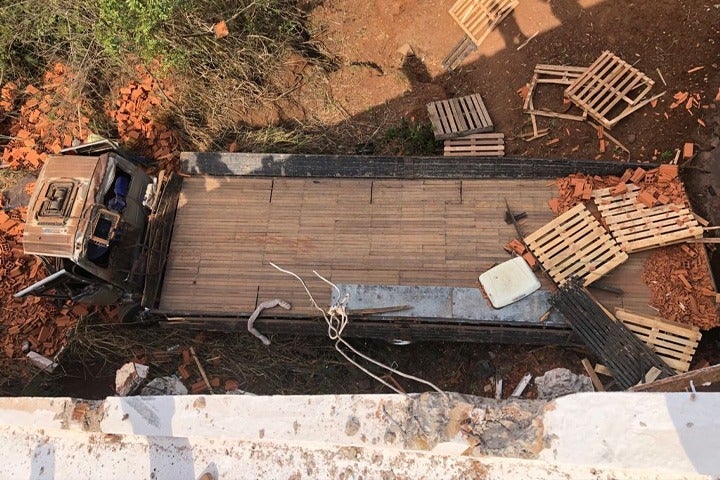Caminhoneiro fica ferido ao colidir contra mureta de ponte e cair em ribanceira