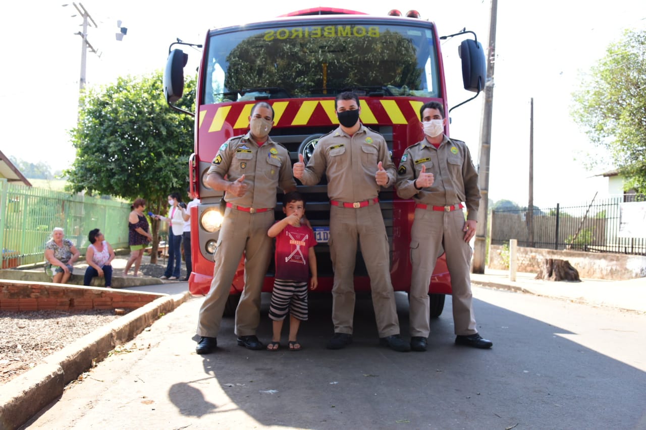 Apesar do susto e do choro, logo na sequência o menino já se recuperou, tirou foto com os bombeiros e conheceu de perto o caminhão utilizado por eles.