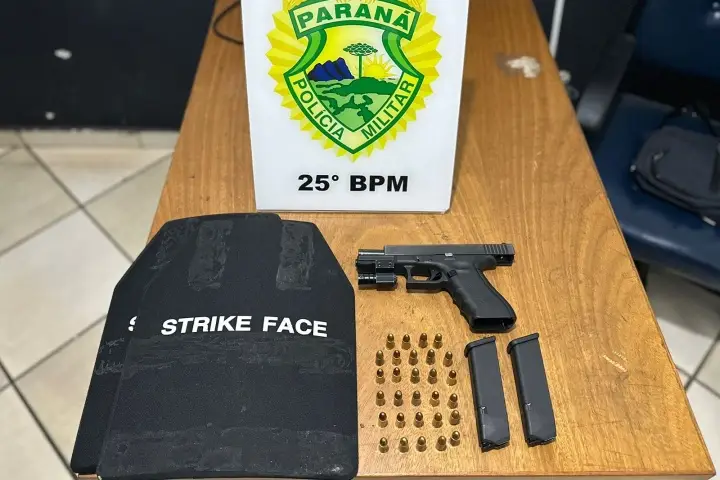 Um homem, de 43 anos e que era procurado pela Justiça, foi preso em uma abordagem policial realizada na noite deste sábado (18), em Umuarama, ao ser flagrado portando uma pistola Glock calibre 9mm e 29 munições intactas. Na casa dele também foi encontrado duas placas balísticas.
