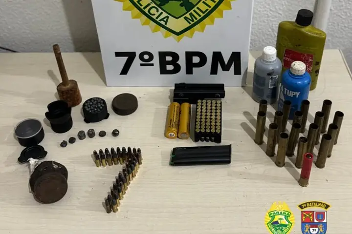 Ao chegar ao local, a polícia constatou que os disparos foram feitos com uma espingarda. Após a contenção e abordagem do suspeito, um homem de 40 anos, foi realizada uma busca no imóvel. Além dos estojos deflagrados de calibre .32, também foram encontrados cartuchos de calibre .22, e diversos materiais usados para recarregar os cartuchos da arma.