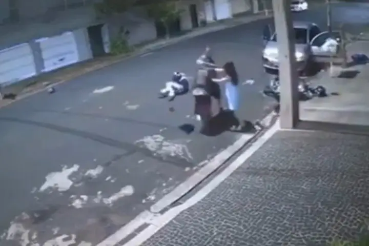 O vídeo, que está circulando pelas redes sociais, mostra o condutor do carro aguardando a mulher, que está saindo de uma residência no município de Uberlândia (MG). Neste momento, uma motocicleta passa por eles e retorna, com os dois ocupantes anunciando o assalto.
