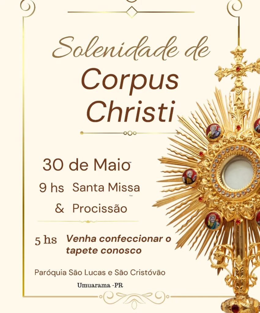 A Diocese de Umuarama divulgou as paróquias que realizarão a solenidade de Corpus Christi na próxima quinta-feira (30). De acordo com a instituição, na Catedral haverá montagem do tapete a partir das 5h da manhã, uma única missa às 9h, seguida de procissão com o Bispo Dom João Mamede Filho.