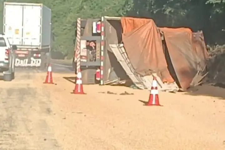 Uma carreta carregada com milho tombou na rodovia estadual PR-323, próximo ao trevo de Tuneiras do Oeste. O acidente aconteceu na tarde desta terça-feira (28) e a carga ficou espalhada na pista.