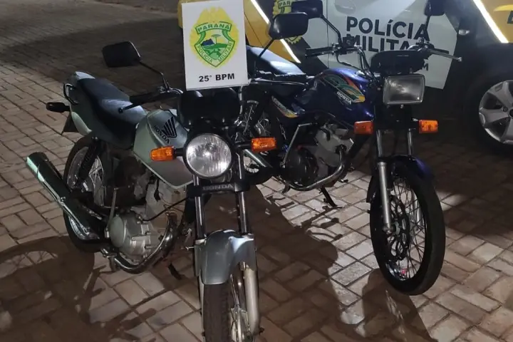Duas motocicletas que haviam sido furtadas na última segunda-feira (27), em Umuarama, foram recuperadas pela Polícia Militar (PM) no fim da tarde desta terça-feira (28), na Estrada Caçadora, na Vila Rural de Pérola. Os veículos estavam em posse de dois jovens, ambos de 17 anos.