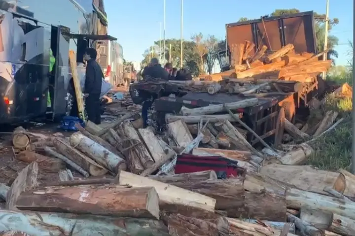 Um ônibus da empresa Viação Garcia bateu em um caminhão carregado de toras de madeira na manhã desta quinta-feira (30) na BR 277, em Cascavel, no oeste do Paraná. O acidente aconteceu entre o posto da Polícia Rodoviária Federal (PRF) e o Show Rural Coopavel.