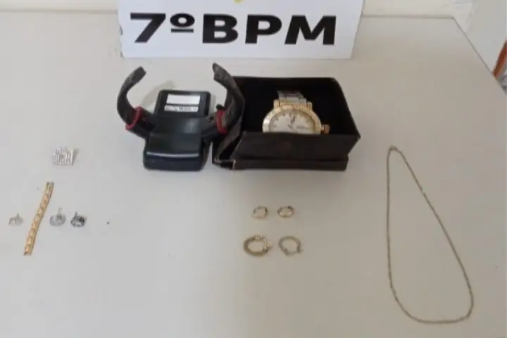 Uma ligação anônima levou a polícia até um barracão na área rural, onde encontraram um dos suspeitos, de 39 anos. Durante a abordagem, foram encontrados com ele vários itens furtados dentro de uma mochila que carregava nas costas. Entre os objetos recuperados estavam um relógio dourado da marca Marinus, uma corrente de ouro e um par de brincos dourados.