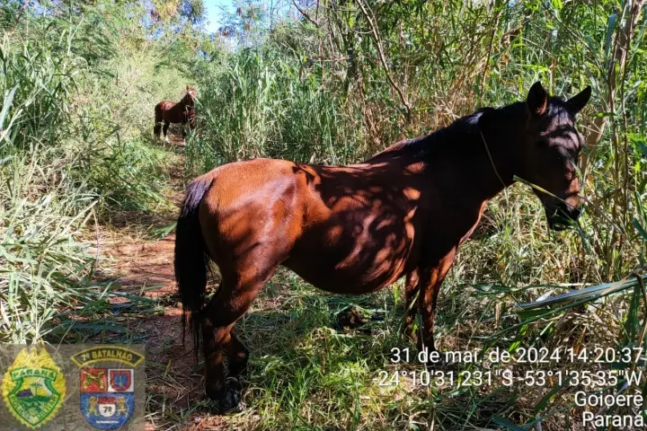 Dois cavalos que haviam sido furtados de uma chácara da AMAA (Associação dos Melhores Amigos dos Animais) de Goioerê foram recuperados pela Polícia Militar (PM), na tarde desta sexta-feira (31). Eles estavam em uma área de pasto no município.
