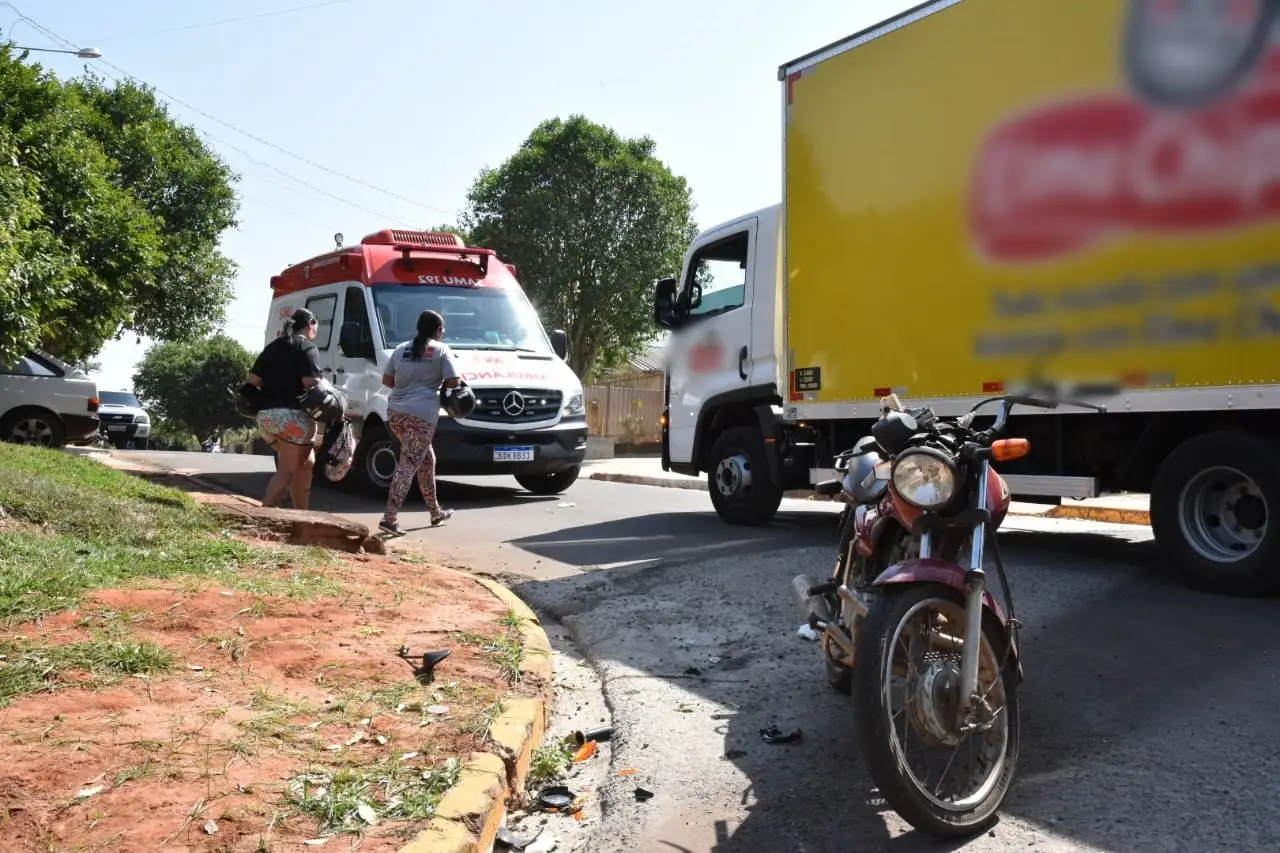 Mãe e filha que estavam em uma motocicleta Honda CG vermelha se envolveram em um acidente de trânsito no início da tarde desta quinta-feira (19) em Umuarama. Elas foram atingidas por um caminhão baú, de entregas.