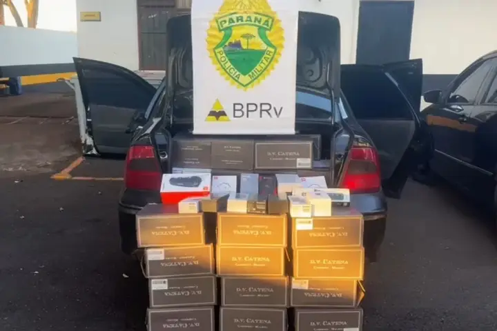 A Polícia Rodoviária Estadual (PRE) apreendeu, no início da manhã desta terça-feira (4), um Chevrolet Vectra que estava carregado com 73 caixas de vinho estrangeiros e 17 eletrônicos, na PR-317, na região de Floresta. De acordo com os policiais, o material está avaliado em R$ 55 mil.