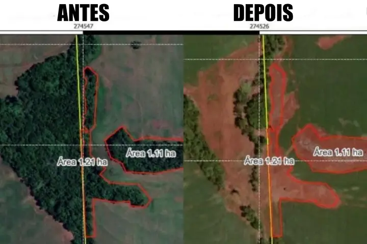 Em vistoria no principal local afetado, foi localizado, em outro imóvel rural no mesmo município, danos ambientais pela intervenção irregular em Área de Preservação Permanente (APP) e fragmento restantes de vegetação nativa em uma área de 0,213 hectares, para confecção de uma estrada.
