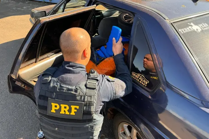 A Polícia Rodoviária Federal (PRF) apreendeu um veículo Volkswagen Santana com 223 quilos de maconha e 4 mil maços de cigarros contrabandeados do Paraguai nesta quarta-feira (05), na BR-487, em Alto Paraíso.