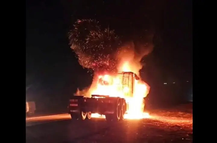 Uma carreta pegou fogo após uma colisão com duas motocicletas na rodovia PRC-272, KM 510 + 500m, no município de Iporã. A situação aconteceu na noite desta quarta-feira (12), perto do trevo de acesso a Altônia.