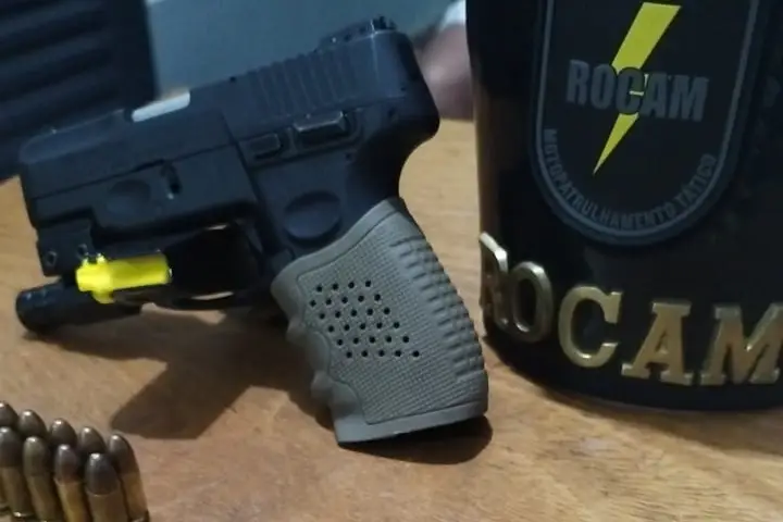 Durante a abordagem, estavam no veículo um homem e uma mulher. Após buscas pessoais e documentais, nada de irregular foi encontrado. Questionado sobre a presença de algo ilícito no carro, o homem admitiu que havia uma arma debaixo do banco do passageiro. Tratava-se de uma pistola Taurus G2C calibre 9mm, com 12 munições intactas e uma mira laser acoplada.