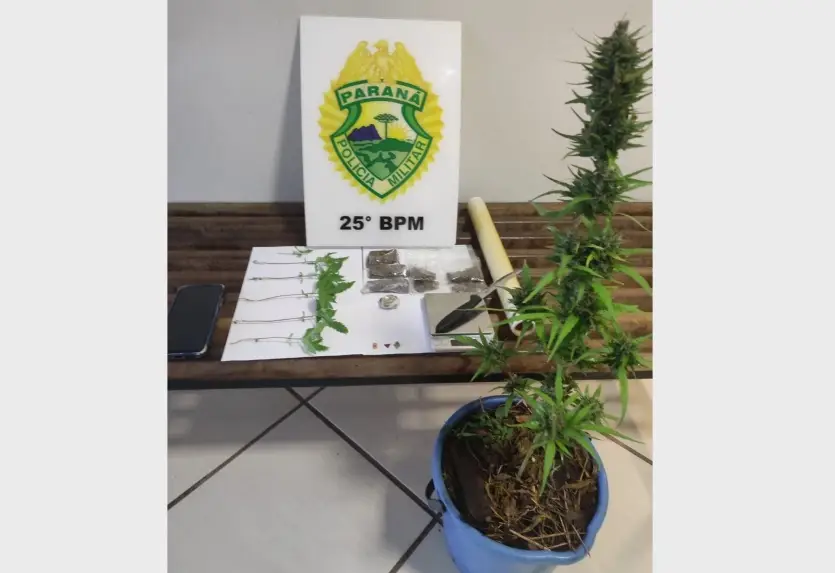 Um jovem de 23 anos foi preso pela Polícia Militar (PM) na tarde desta segunda-feira (8) em Umuarama após denúncia de que estaria com uma arma de fogo ameaçando pessoas. O fato aconteceu por volta das 14h45 na Estrada Beija Flor, zona rural do município. Com ele os policiais encontraram drogas e pés de maconha.
