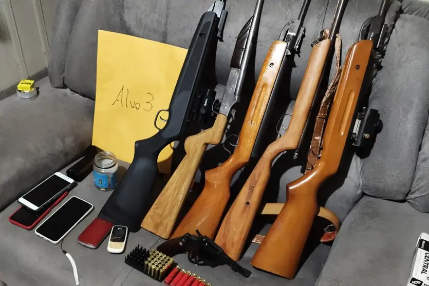 Em decorrência dos cumprimentos dos mandados de busca foram localizados: uma pistola calibre 380; dois revólveres calibre 32; um revólver calibre 22; um revólver calibre 38; duas espingardas calibre 22; uma espingarda calibre 36; uma espingarda calibre 32; além de 134 munições das respectivas armas de fogo; cinco aparelhos celulares e R$ 4.956,00 em dinheiro.