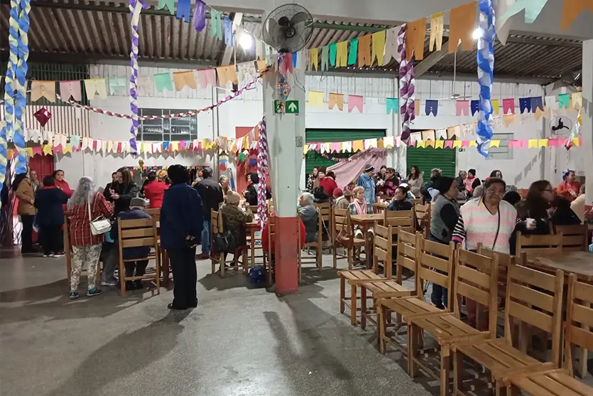 A festa julina do SCFVI contou com bolo de milho, quentão e outras comidas típicas, um cenário decorado para fotos e a tradicional dança da quadrilha, com participantes vestidos a caráter.
