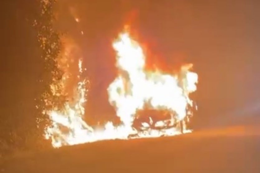 O fogo consumiu o automóvel por completo e também atingiu a vegetação às margens da rodovia