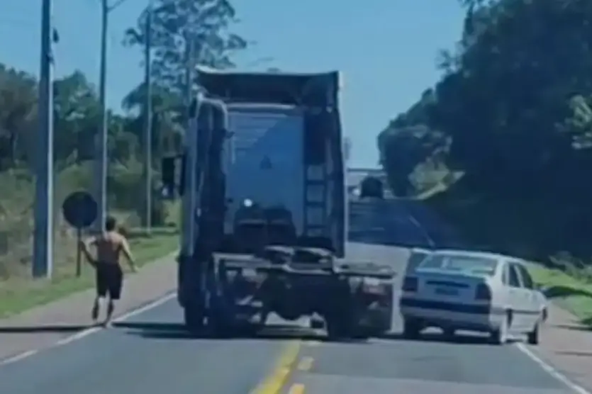 Uma briga de trânsito assustou motoristas na PR-423, em Araucária, Região Metropolitana de Curitiba, na tarde do último sábado (20). O motorista de um veículo atravessou o carro na frente de um caminhão, quase causando um grave acidente.