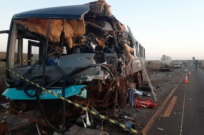 A colisão frontal envolveu um caminhão de transporte de ração, Ford/Cargo 2428 com placas de Umuarama e um ônibus M.Bens/Comil Campione emplacado em Palotina.