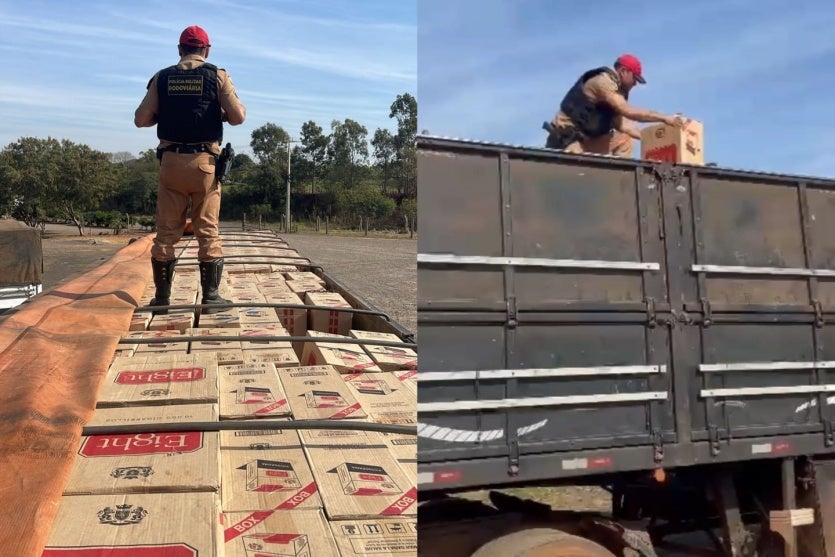 Os policiais checaram no compartimento de carga do semirreboque e constataram uma carca com aproximadamente 700 caixas de cigarros do Paraguai, avaliadas em R$ 1.050.000. Além disso, o caminhão e o semirreboque possuíam alerta de furto em São Paulo.