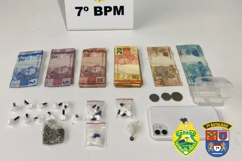 Os militares foram até a casa do adolescente, onde encontraram mais drogas e dinheiro, além de duas balanças de precisão, um rádio comunicador e um simulacro de arma de fogo. Ao todo, foram apreendidos 128 gramas de maconha, 25 buchas de cocaína (totalizando 20 gramas), uma porção de haxixe e R$ 642 em notas variadas.