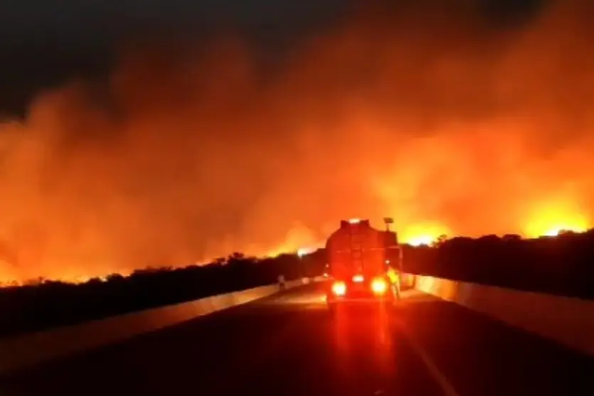 Um incêndio de grandes proporções pintou o céu noturno às margens do rio Paraná, próximo à fronteira com Porto Camargo, em Icaraíma, na noite desta quarta-feira (7). As chamas foram filmadas por um condutor que passou pelo local (assista abaixo).