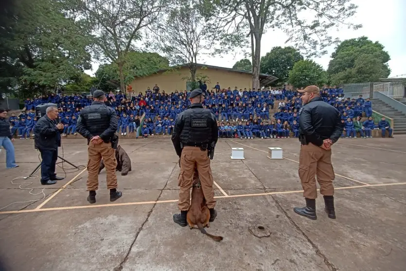 Policiais militares do Grupo de Operações com Cães realizaram, nesta sexta-feira (9), uma visita aos alunos do Colégio Cívico-Militar Padre Manuel da Nóbrega, em Umuarama.