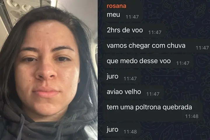 “Meu, 2 horas de voo. Vamos chega com chuva. Que medo desse voo, juro. Avião velho, tem uma poltrona quebrada”, escreveu Rosana. Em seguida, a jovem enviou uma foto dentro do avião.