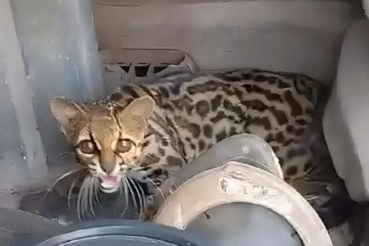 Um filhote de jaguatirica foi flagrado nesta semana por um morador do condomínio Monte Carlo Residence, localizado às margens do Rio Ivaí, em Floresta, Paraná. O animal silvestre foi encontrado no porta-malas de um veículo estacionado na rampa náutica do condomínio.
