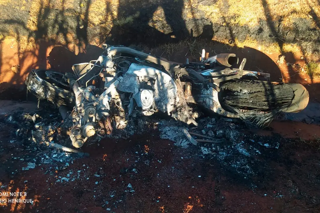 Com o impacto, a moto pegou fogo e ficou completamente destruída.