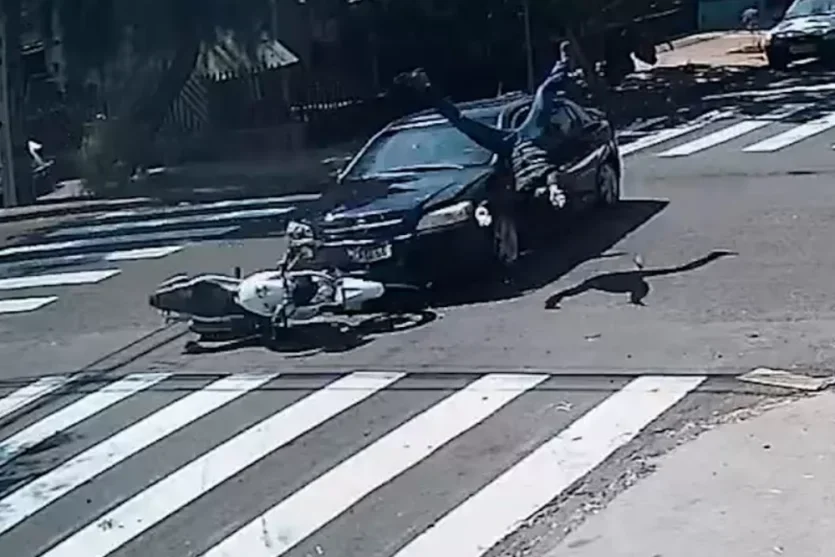 Um motociclista de 24 anos ficou ferido em um acidente ocorrido na Vila Pioneira, em Toledo, na tarde desta terça-feira (3). Imagens de uma câmera de segurança mostram que a Honda CB 300 trafegava pela Rua da Igreja, enquanto o Chevrolet Astra seguia pela Rua Tarumã. No cruzamento dessas vias, ocorreu a colisão violenta.