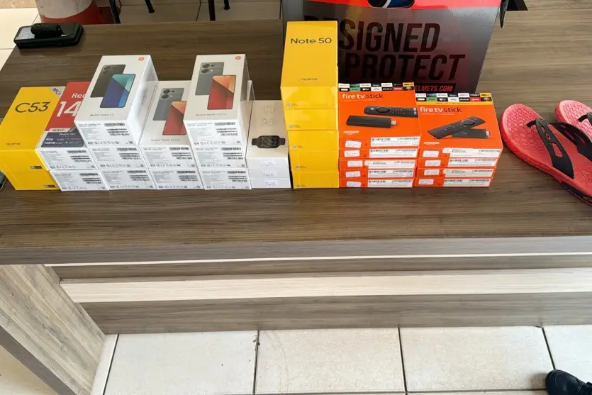 A PM fez patrulhamentos e avistou o automóvel. O condutor foi abordado e a equipe fez buscas no veículo. Foram encontrados no bagageiro 18 aparelhos celulares, 3 relógios e 9 receptores de TV pirata.