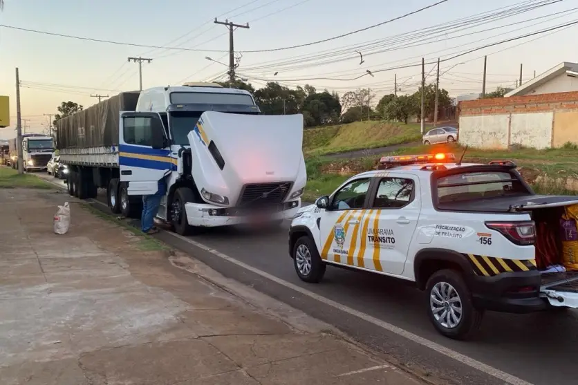 O caminhão está parado entre a avenida Porto Alegre e a PR-580 (futura avenida Pedromiro José Fernandes), perto do trevo de acesso ao bairro Jabuticabeiras. O caminhoneiro é do município de Naviraí/MS.
