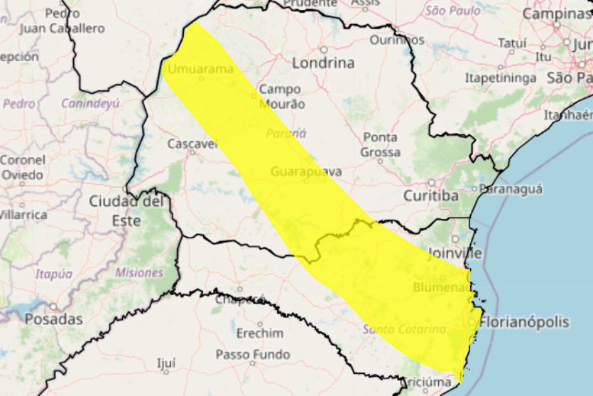 O Instituto Nacional de Meteorologia (Inmet) emitiu, nesta quinta-feira (19), um alerta amarelo para tempestades na região de Umuarama, abrangendo parte do Paraná e Santa Catarina. O aviso entra em vigor às 2h30 e vai até às 12h desta sexta-feira (20).
