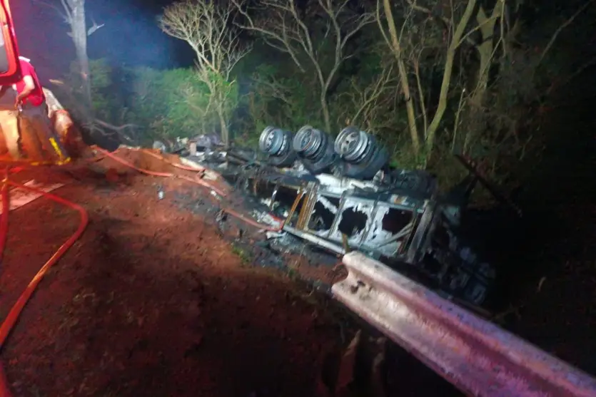 Com a colisão, o caminhão capotou sobre a margem da pista, resultando em um incêndio que teve que ser contido com apoio do Corpo de Bombeiros.