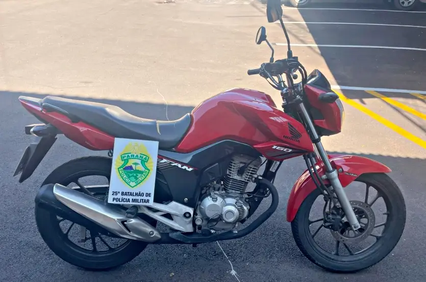 Uma motocicleta Honda/CG 160 Fan de cor vermelha que tinha sido furtada no último sábado (28) foi recuperada pela Polícia Militar (PM) de Umuarama pouco tempo depois. A vítima, de 23 anos, é entregador de um restaurante, que foi furtado enquanto trabalhava.